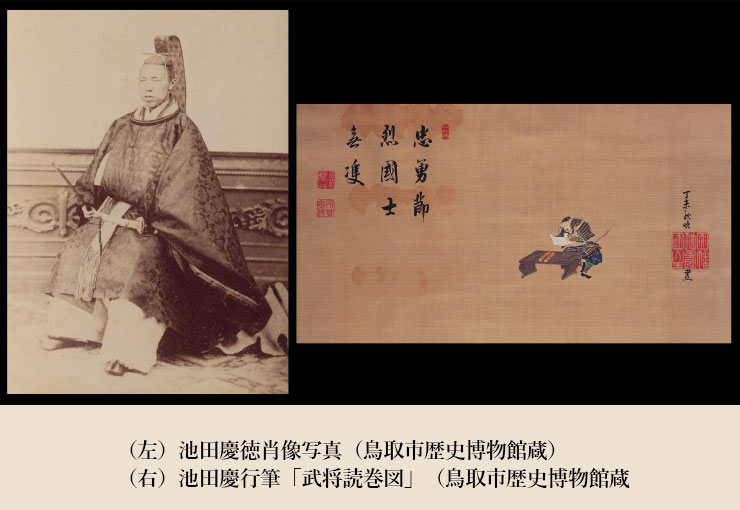 【画像】(左)池田慶徳肖像写真(鳥取市歴史博物館蔵) (右)池田慶行筆「武将読巻図」(鳥取市歴史博物館蔵)