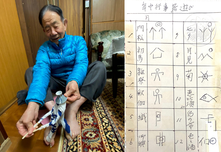 【画像】左:足芸の安来節(手拭と割箸2膳と杯1個で演じる) /右:年中行事箸遊び